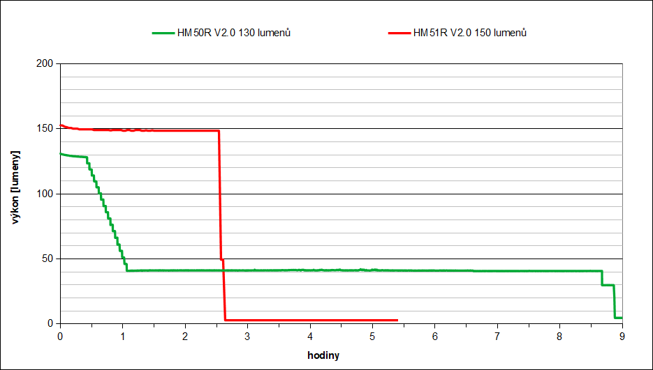 U višim načinima rada, snaga se smanjuje tijekom osvjetljenja kako bi se spriječilo pregrijavanje. Ako je snaga regulirana elektronikom kako bi se uštedjela baterija, može se smanjiti čak iu nižim modovima bez obzira na temperaturu. Ovisno o tome kako je proizvođač postavio. Kako bismo što bolje mogli procijeniti svjetlosne karakteristike pojedinih modela, postavljamo graf sa lampama s tijekovima mjerenja snage i izdržljivosti. Stoga vas molimo da uzmete u obzir ovu mjeru pri odabiru prikladnog proizvoda za svoje potrebe. Pogledajte primjere grafikona sličnih prednjih svjetala u nastavku.