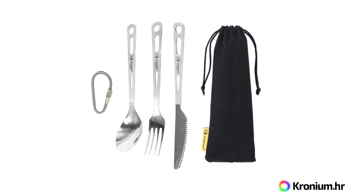 Ultra lagani set pribora za jelo od titana uključuje žlicu, vilicu i nož. Bez obzira idete li u kolibu ili na Himalaju, ovaj nesalomljivi pribor za jelo dobro će vas poslužiti i uštedjeti prostor i težinu tijekom svih vaših avantura na otvorenom. Set je izrađen od lagane i iznimno čvrste legure titana s pjeskarenim ručkama. Korišteni materijal nije korozivan, hipoalergen i može se prati u perilici posuđa. Ne sadrži BPA.