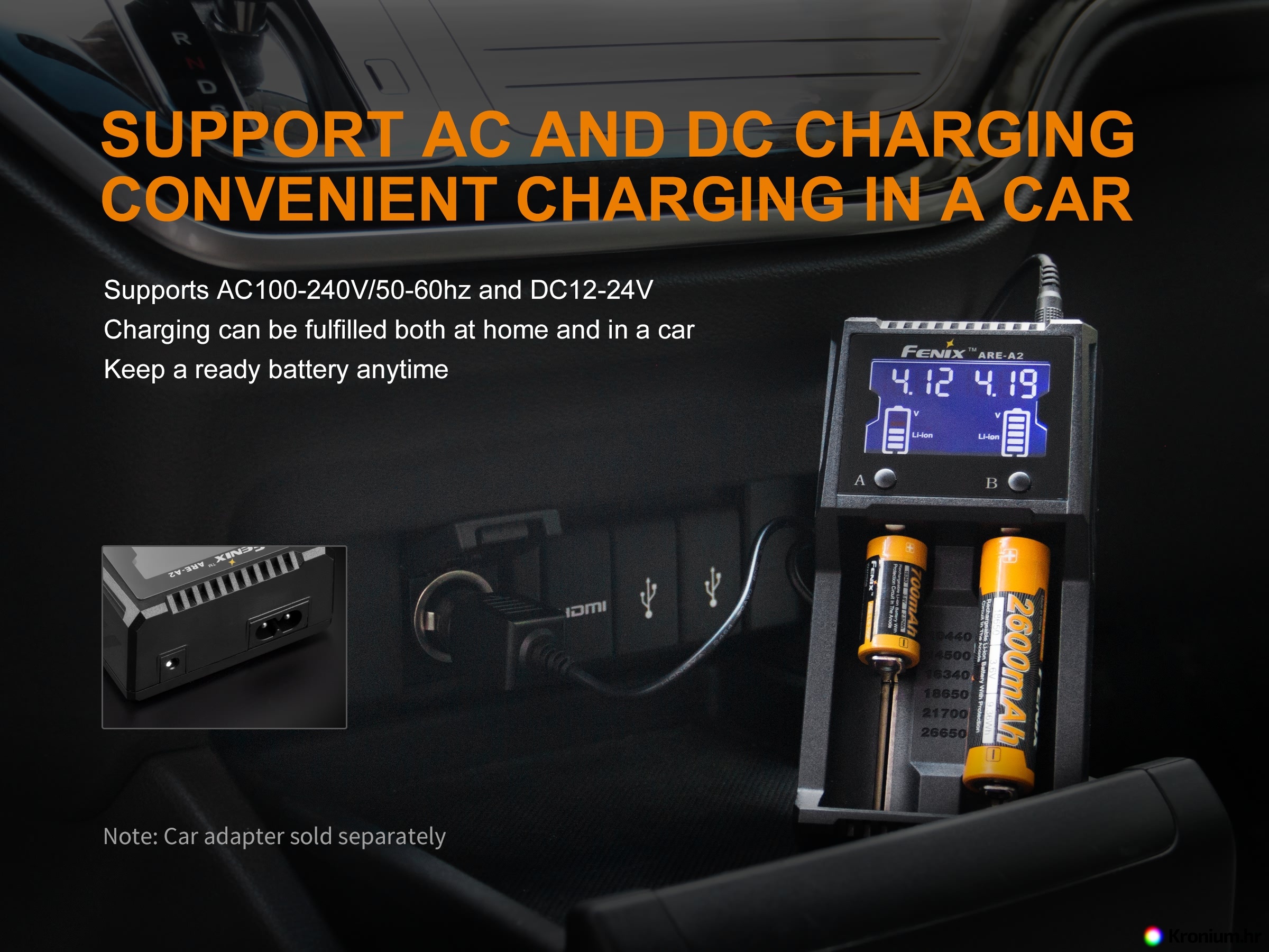 Univerzalan punjač s dva kanala Fenix ARE-A2 namjenjen je za 3,7V/3,6V Li-ion i NiMH/NiCd baterije. Svaki slot za punjenje monitoriran je neovisno, te je više baterija raznih veličina, kapaciteta, čak i različitog kemijskog sastava (Li-ion i NiMH/NiCd) moguće puniti odjednom. Automatski prepozna postavljeni tip baterija i nađe optimalan algoritam punjenja.