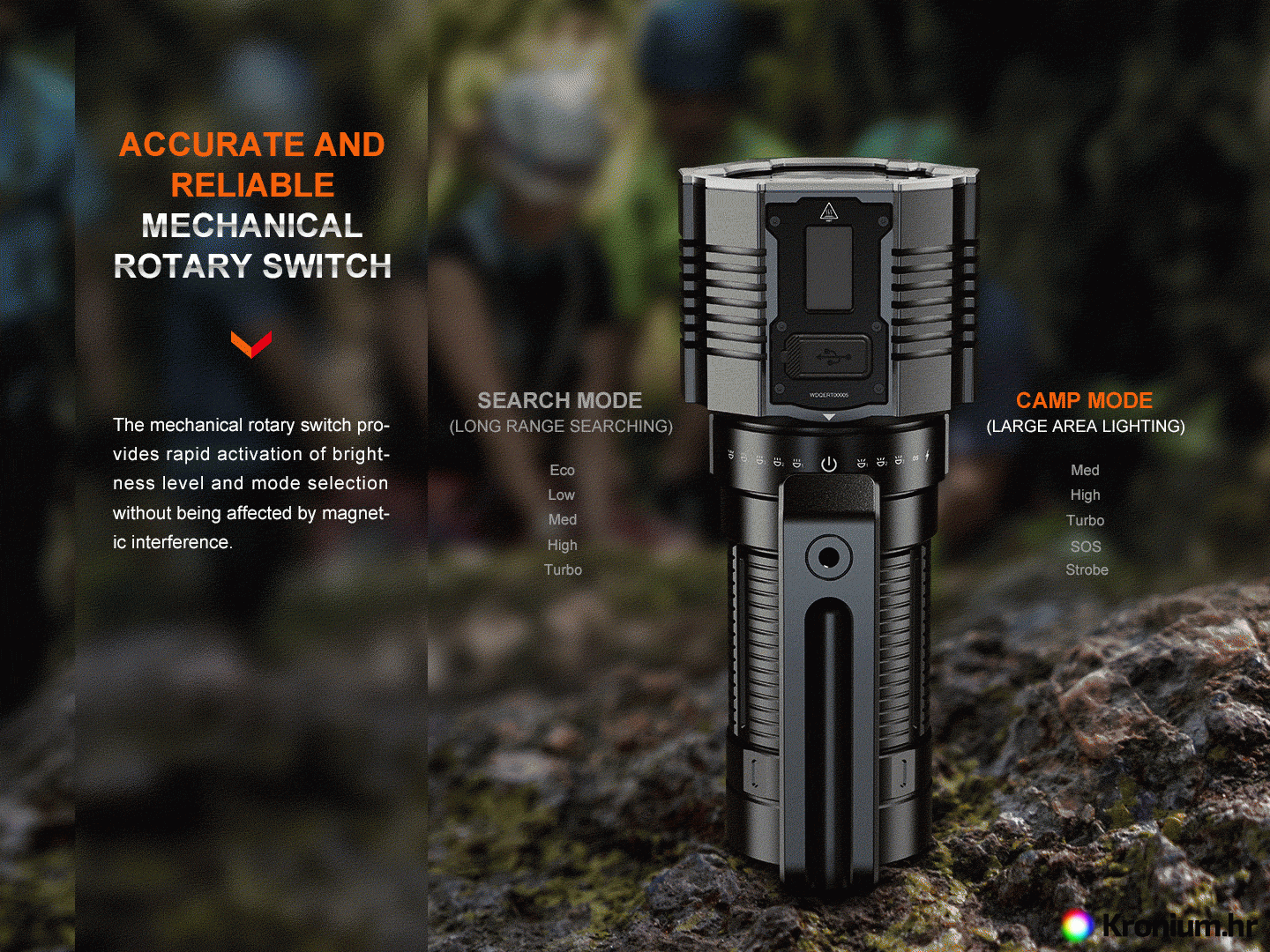 - Kamperski način: 15000 lumena (2,17 sati) -> 6000 lumena (3 sata) -> 2000 lumena (5,4 sata) i SOS 300 lumena –> Stroboskop 9000 lumena.