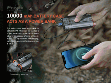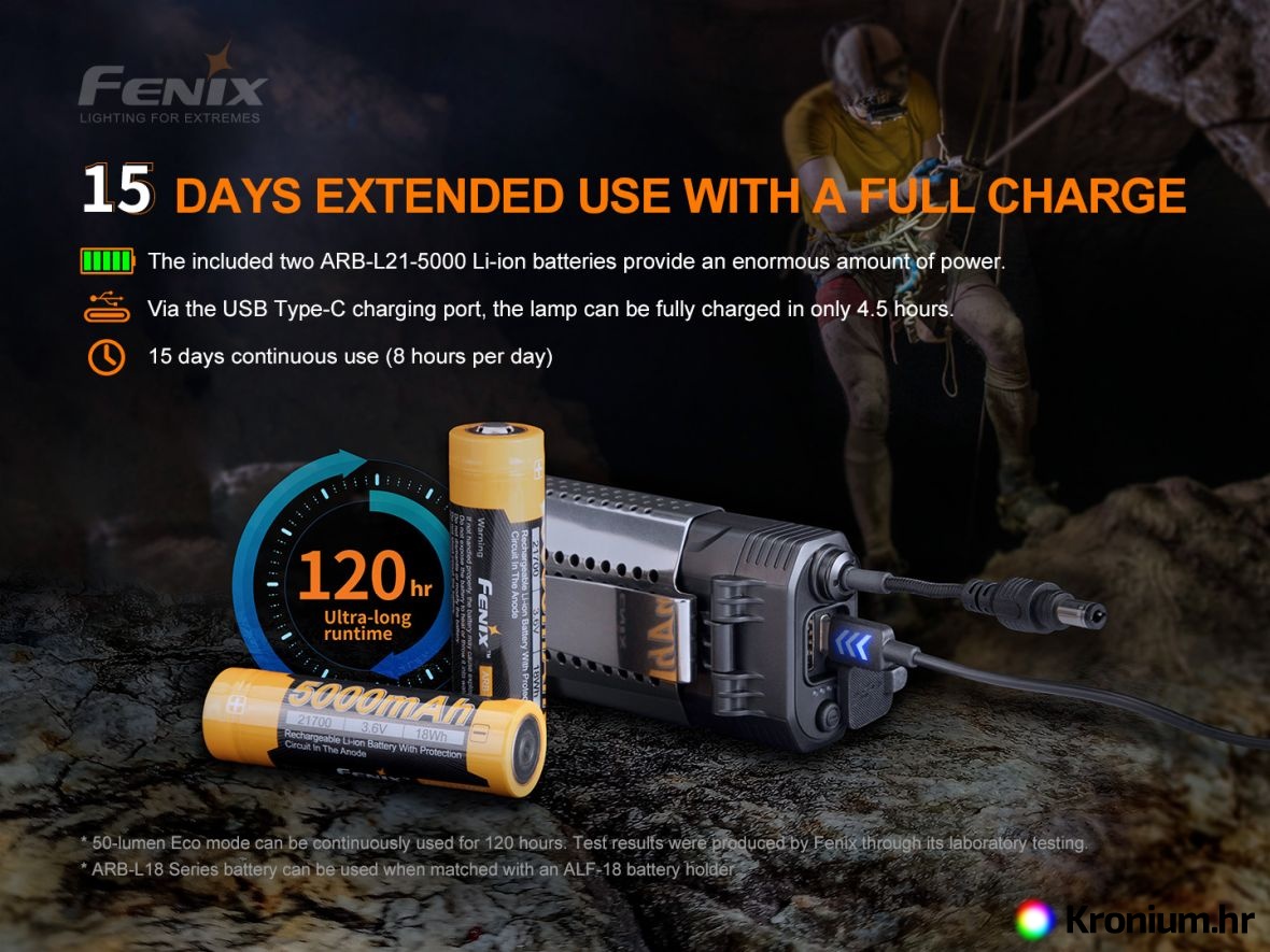 - Dio pakiranja: naglavna svjetiljka, dva akumulatora Fenix 21700 5000 mAh, nehrđajući nosač za učvršćenje baterijskog kućišta na remen, 3 plastične kvačice za prikvačenje kabela na remen glave, 4 držača za prikvačenje remena glave na kacigu, produljeni kabel uz baterijsko kućište, USB-C konektor i rezervni o-kružić.
