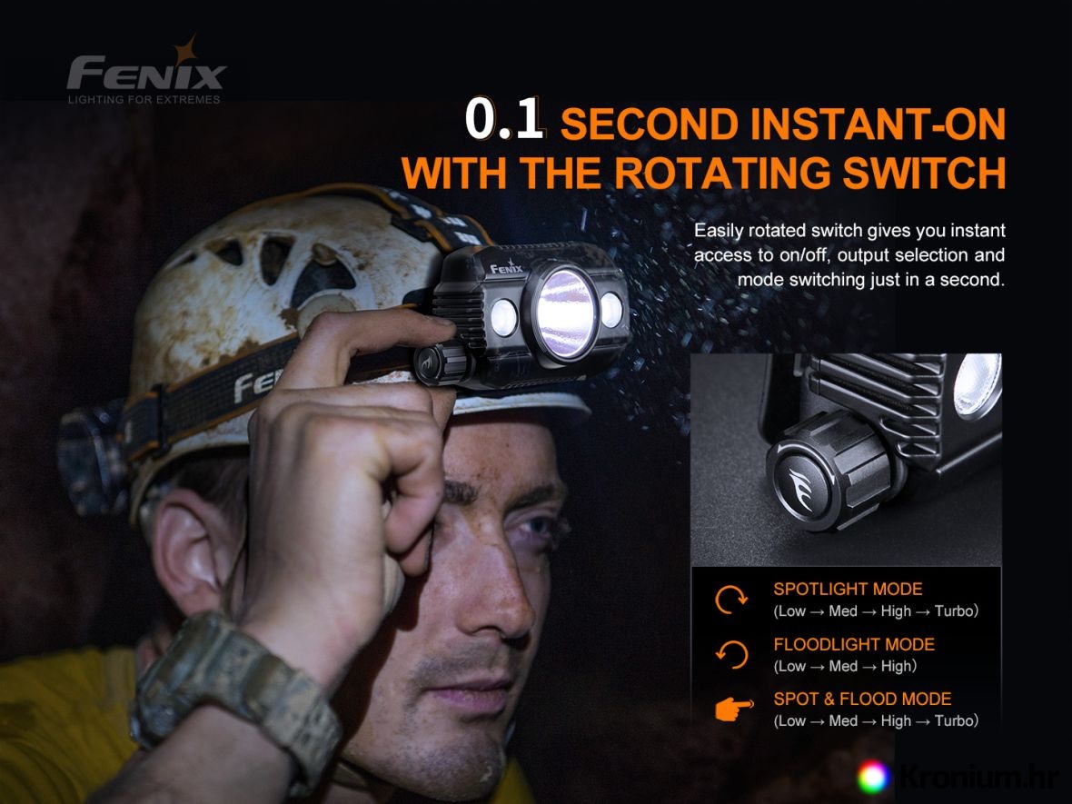 - daljinski reflektor – za uključenje daljinskog reflektora okrenite gumb u smjeru kazaljki sata, naglavna svjetiljka se upali na najniži režim snage i okretanjem se diže snaga opterećenja do najvišeg režima. Okretanjem unatrag se snaga smanjuje.