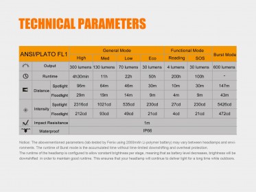 Svi parametri naglavne svjetiljke (svjetlosni tok, vrijeme rada na baterije, vodonepropusnost, svjetlosni doseg i otpornost na udarce) su izmjereni prema normi ANSI/NEMA FL 1-2009.