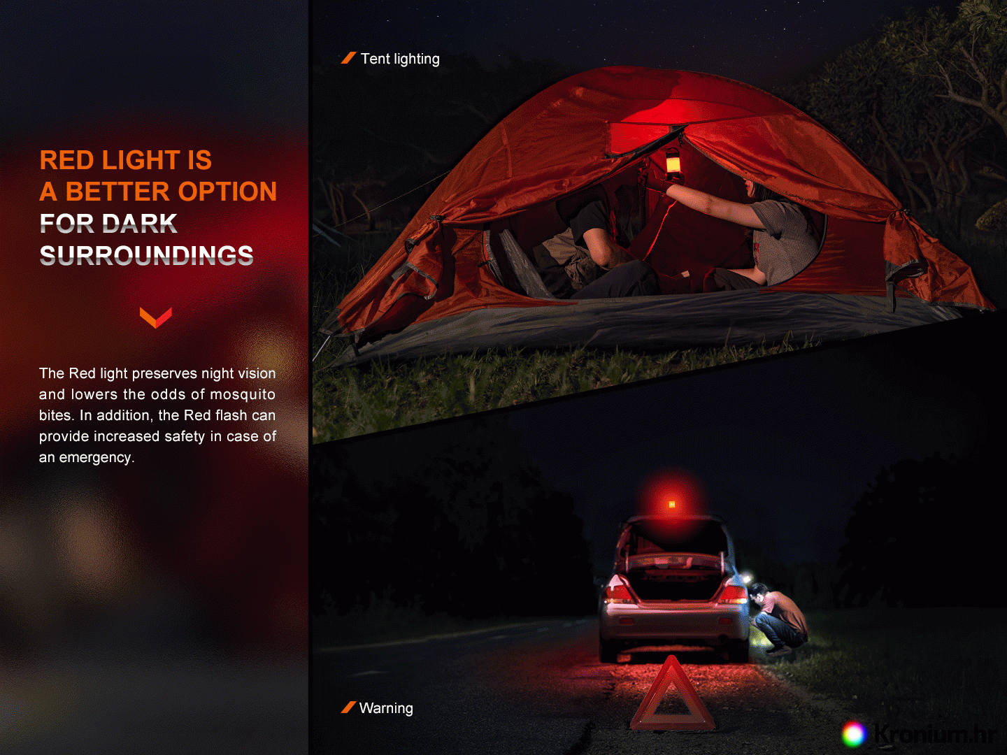 - Šest načina kružnog svjetla: 500 lumena (10 sati) -> 200 lumena (13 sati) -> 50 lumena (40 sati) -> jednosmjerno svjetlo 25 lumena (67 sati) -> crveno svjetlo 3 lumena (125 sati) -> crveno treptavo svjetlo 3 lumena (240 sati).