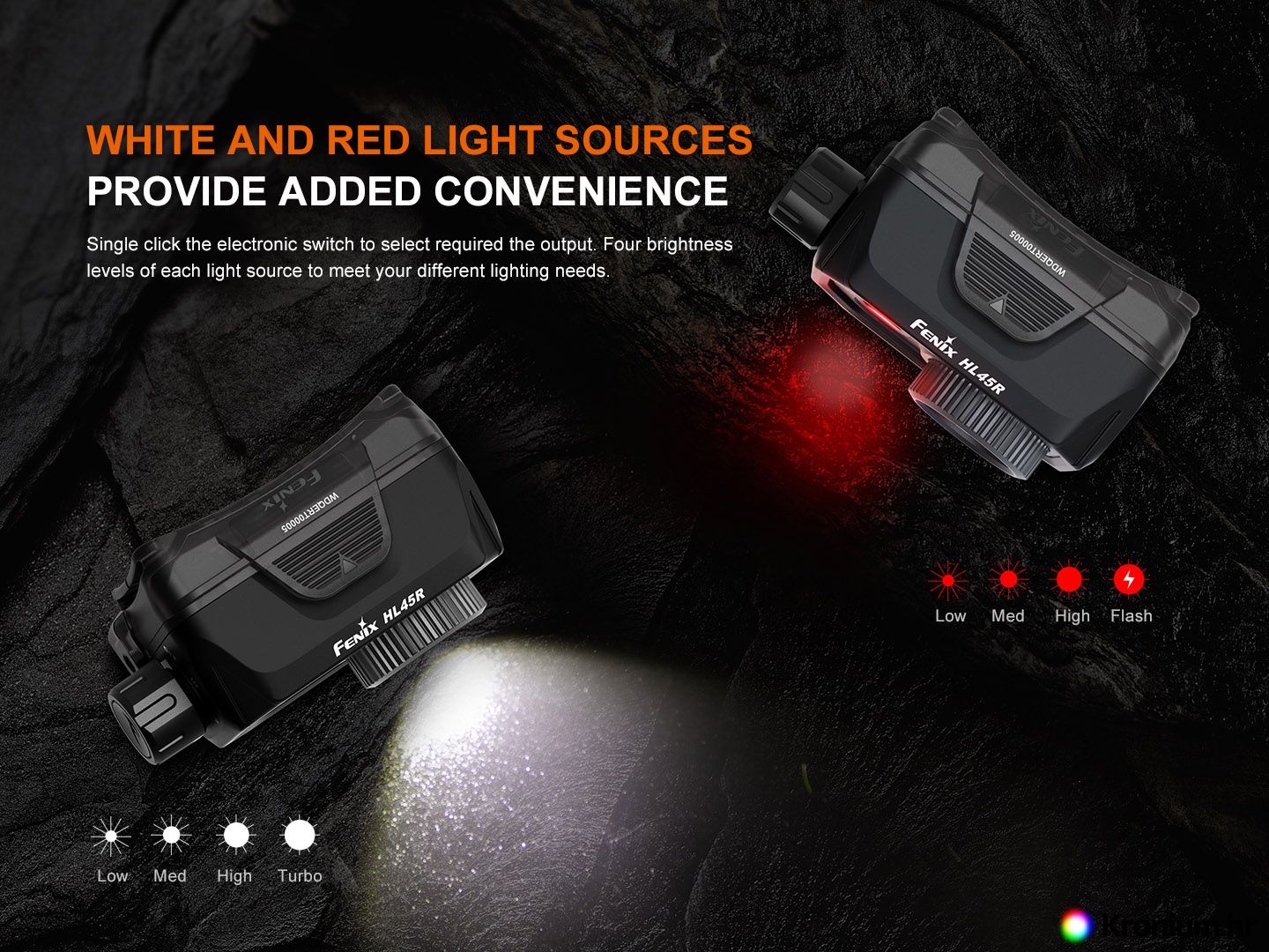 Fenix HL45R Zoomable Rechargeable Headlamp pruža svjetlosni tok do 1000 lumena (ANSI) i naknadni sjaj do 220 metara i funkciju za beskontaktno uključivanje i isključivanje. Funkcija Gesture-sensing omogućuje vam paljenje i gašenje svjetla mahanjem ruke ispred prednjeg svjetla (funkcija se može deaktivirati). Tako da tijekom rada možete zaštititi ruke od blata, ulja i bilo čega, a svjetiljka će i dalje ostati čista. Napajanje osigurava Li-ion akumulator kapaciteta 1900 mAh koji se puni preko USB - Ckonektor izravno u prednjem svjetlu. Baterija se može izvaditi i zamijeniti u hitnim slučajevima s tri obične AAA baterije (ne mogu se puniti u prednjoj svjetiljci). Izvor svjetla je moderni LED Luminus SFT-25R, njegovo svjetlo usmjerava posebna TIR (Total Internal Reflection) optika s mogućnošću podešavanja širine svjetlosnog konusa (funkcija zumiranja. Osim toga, također ima crvenu LED diodu OSRAM GR QSSPA1.23, koja doseže do 130 lumena.
