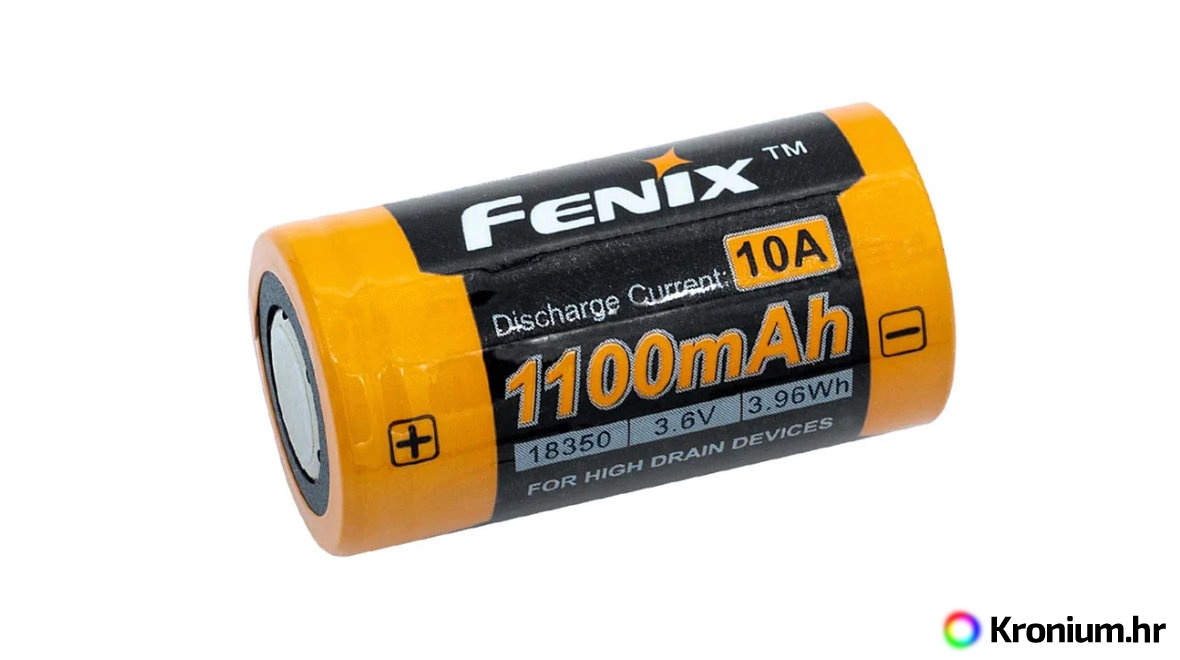 Baterija na punjenje Fenix ARB-L18-1100P (18350) za svjetiljku Fenix GL19R. Moguće ju je puniti u svjetiljki ili u klasičnom punjaču. Li-ion baterije na punjenje se ističu vrlo visokim kapacitetom, ne koriste efekt pamćenja niti se prazne samovoljno. Li-ion tehnologija donosi jedan od najboljih omjera količine sačuvane energije prema težini članka.