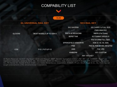 - Kompatibilna sa šipkama oružja standarda Picatinny MIL-STD-1913 i GLOCK