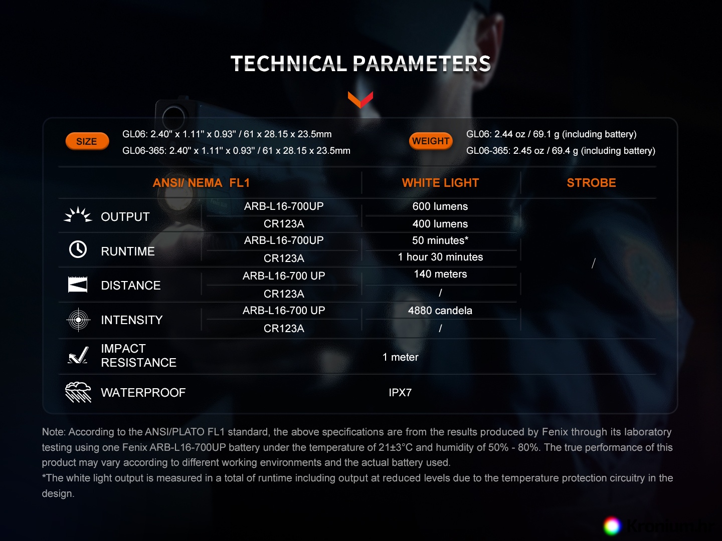 LED svjetiljka za pištolj Fenix GL06 je konstruirana posebno za korištenje na kratkim cijevima opremljenima šipkom za oružje standarda Picatinny MIL-STD-1913 i Glock. Nudi maksimalnu snagu svjetla 600 ANSI lumena s dosegom do 140 metra. Svjetiljka je napajana jednom Li-ion baterijom Fenix ARB-L16-700UP s integriranim micro-USB konektorom (baterija i kabel su dio pakiranja). Ako je potrebno, moguće je koristiti i jedokratnu litium bateriju CR123A. Pojednostavljeno upravljanje svjetiljkom je obostrano (za dešnjake i ljevake). Montaža na šipku oružja je jednostavna i nije potrebna pomoć alata – svjetiljka se navuče na šipku i osigura polugom. Moguće je pričvrstiti i na šipke oružja standarda Picatinny MIL-STD-1913 i GLOCK (ne odgovara oružju iz kategorije slimline, primjerice model Glock 30). Odgovara na službeno oružje češke policije (CZ 75D i P10). Svjetiljka je pogodna za profesionalce, sportske i hobby strijelce te za airsoft.