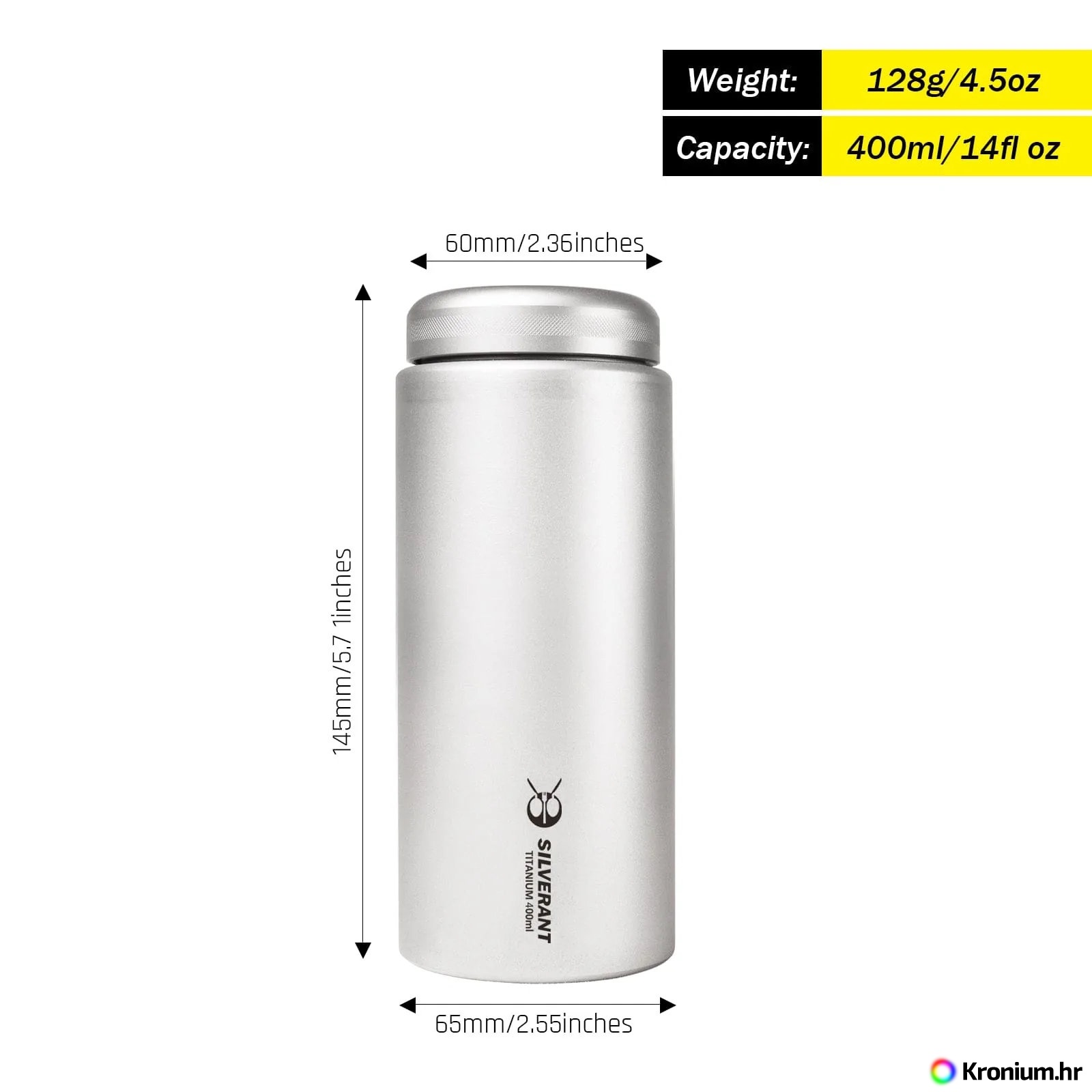 Iznimno lagana, izdržljiva boca od 400 ml SilverAnt od legure titana napravljena je za doživotnu avanturu. Nosite svoje omiljeno piće svugdje sa sobom, u ured, dok se bavite sportom, planinarite i putujete. Boca ima široko grlo (tzv. widemouth), tako da je ugodno piti iz nje kao iz šalice. Dolazi s termo navlakom, možete duže uživati u vrućoj kavi i čaju, a ljeti navlaka održava vaša ohlađena pića na optimalnoj temperaturi. Upotrijebljeni materijal ne ostavlja nikakav naknadni okus ili miris tekućinama koje se prevoze. Ne sadrži BPA i otporan je na koroziju.