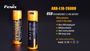Baterija na punjenje Fenix 18650 2600 mAh (L 18-2600U) s vlastitim micro-USB konektorom. Možete je puniti prikopčavanjem kabela u micro-USB konektor (primjerice iz računala ili punjačem mobilnog telefona) ili u klasičnom punjaču. Li-ion baterije na punjenje se ističu vrlo visokim kapacitetom, nemaju efekt pamćenja i ne prazne se samostalno. Li-ion u veličini 18650 su najbolji izbor glede očuvanja energije, te s obzirom na dimenzije i težinu baterije.