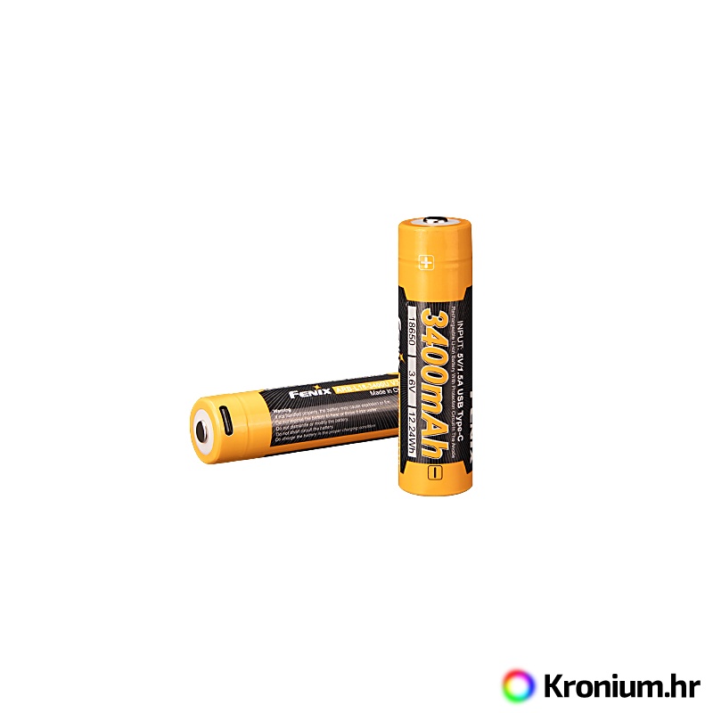 Fenix 18650 3400 mAh punjiva baterija s vlastnim USB-C priključkom (ARB-L18-3400U V3.0). Bateriju možete puniti povezivanjem USB-C kabela (npr. s računala ili punjačem za mobilni telefon) ili u punjaču koji podržava Li-ion akumulatore dužine 70 milimetara. Li-ion punjive baterije odlikuju se vrlo visokom kapacitetu, ne pate od memorijskog efekta niti samostalnog pražnjenja. Ova nova verzija baterije kraća je za 2 mm u odnosu na prethodnu, čime ima bolju kompatibilnost sa svjetlima i naglavnim lampama Fenix od drugih USB-C akumulatora.